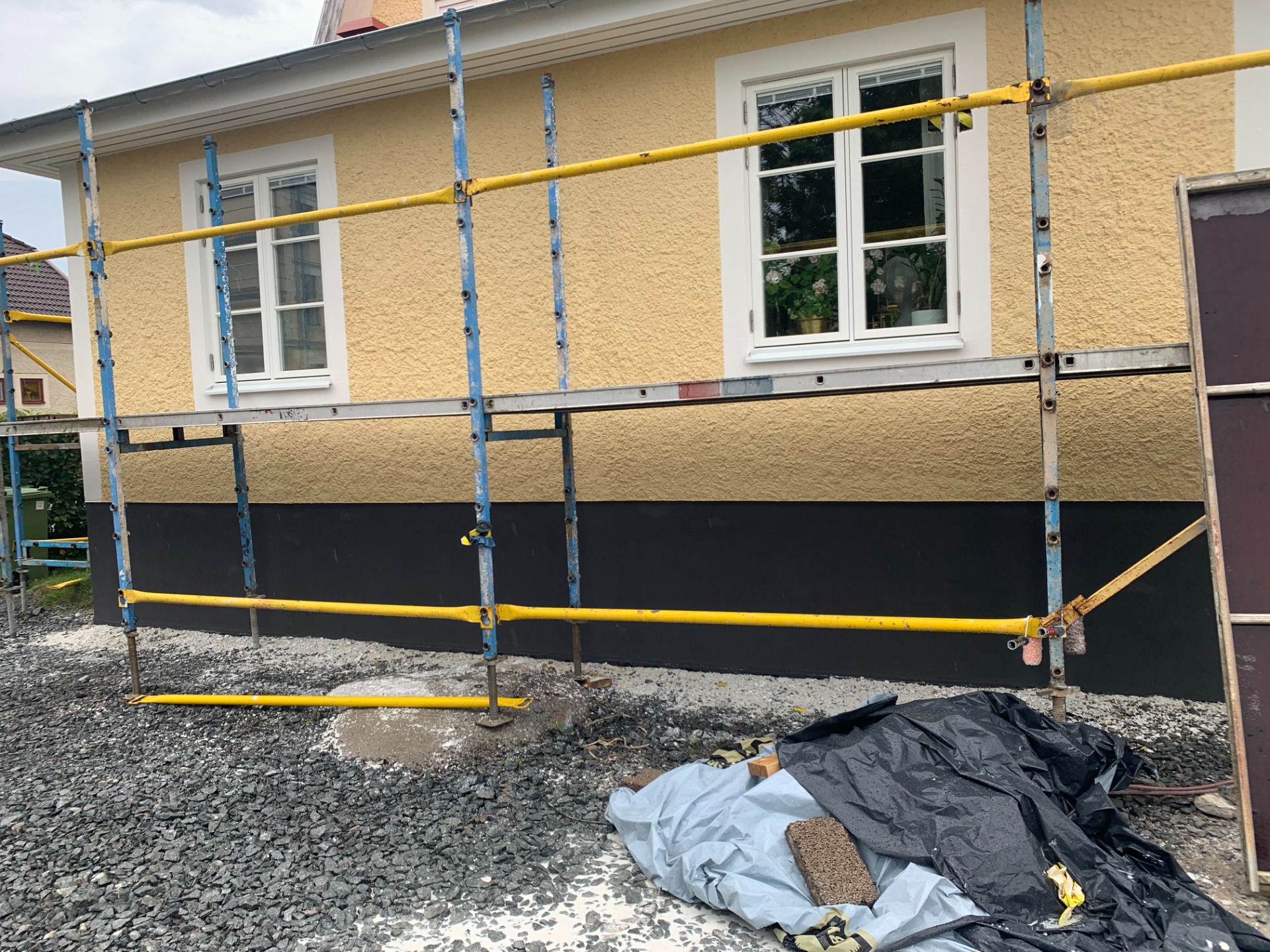 Tilläggsisolerar och putsar en tillbyggnad i Laxå. Här har vi efterliknat ytskiktet som är på den äldre byggnaden. Handslagen spritputs .